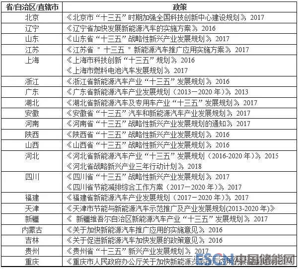 早在2001年,科技部發(fā)布的“國家“863”計劃重大專項”就將燃料電池汽車研究開發(fā)列入其中;到了近些年,緊密出臺的《節(jié)能與新能源汽車產(chǎn)業(yè)發(fā)展規(guī)劃(2012—2020年)》、《中國制造2025》、《能源技術(shù)革命創(chuàng)新行動計劃(2016-2030年)》、《國家創(chuàng)新驅(qū)動發(fā)展戰(zhàn)略綱要》、《“十三五”國家戰(zhàn)略性新興產(chǎn)業(yè)發(fā)展規(guī)劃》以及《汽車產(chǎn)業(yè)中長期發(fā)展規(guī)劃》等文件,均明確提及要重點研發(fā)氫能與燃料電池技術(shù),表現(xiàn)出中央政府對該新型能源技術(shù)的大力支持。此外,多個省/自治區(qū)/直轄市也積極布局燃料電池產(chǎn)業(yè),形成了巨大的引領(lǐng)效應(yīng)(統(tǒng)計如下表)。