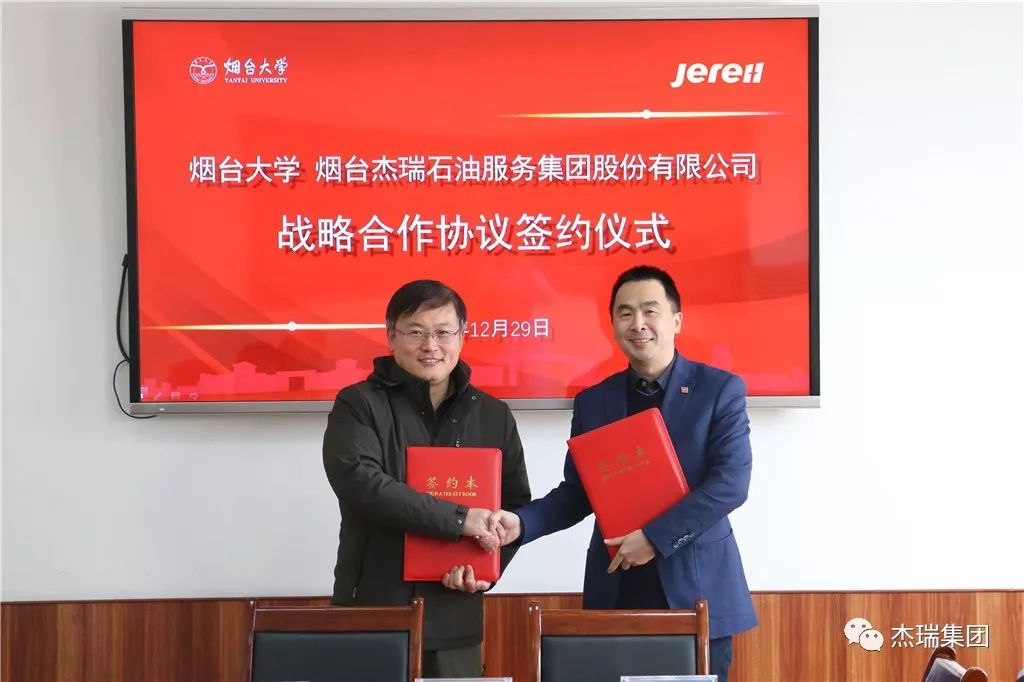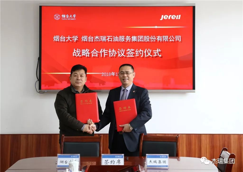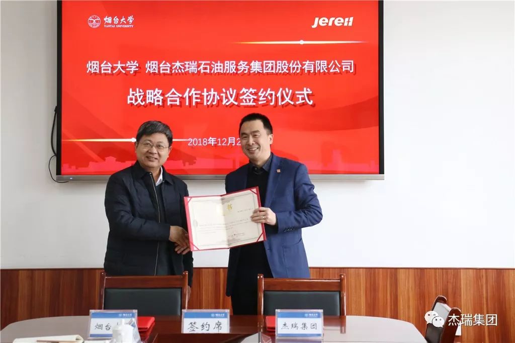 12月29日上午,“煙臺大學與煙臺杰瑞石油服務集團股份有限公司戰略合作協議”簽署儀式在煙臺大學舉行,煙臺大學黨委常委、副校長孫祥斌和杰瑞集團高級副總裁王丕學代表雙方簽字。煙臺大學黨委書記張偉、杰瑞集團副總裁謝猛出席簽約儀式并致辭,煙臺大學黨委常委、副校長郝曙光主持儀式。此次簽約標志著雙方今后將在人才引進和培養、產學研對接、科技創新、成果轉化等方面開展全方位的深入合作。