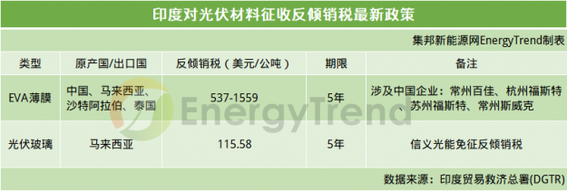 此外,印度貿(mào)易總署(DGTR)還建議對從中國、馬來西亞、沙特以及泰國進(jìn)口的光伏組件用EVA薄膜征收537-1559美元/公噸(MT)的反傾銷稅,期限為5年。