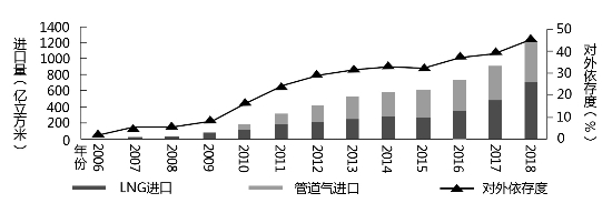 中國(guó)天然氣進(jìn)口量及對(duì)外依存度變化(來(lái)源:2018年國(guó)內(nèi)外油氣行業(yè)發(fā)展報(bào)告)