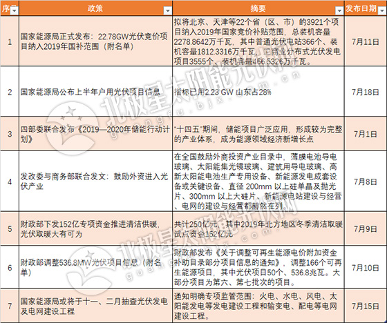 7月,國家政策主要包括光伏補貼競價機制、戶用光伏市場、財政部調整可再生能源補貼、光伏取暖等。