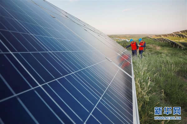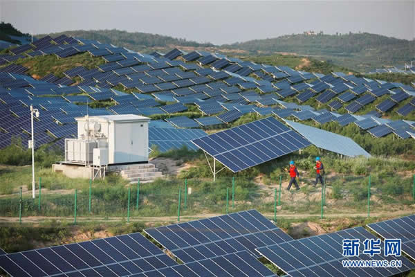 國網內丘縣供電公司技術人員在內丘縣柳林鎮虎頭山光伏電站內巡檢(8月21日攝)。新華社記者 牟宇 攝
