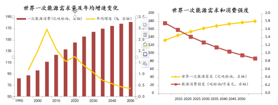 根據(jù)報(bào)告分析了世界一次能源的變化形式,一個(gè)“漲”字將貫穿從現(xiàn)在到2050年期間的世界一次能源的發(fā)展態(tài)勢(shì)。世界一次能源的年均增長(zhǎng)幅度為0.89%,其中,2015-2035年年均增長(zhǎng)1.2%,2036-2050年年均增長(zhǎng)0.45%,增速逐漸放緩,世界一次能源需求量預(yù)計(jì)到2050年達(dá)到182億噸標(biāo)油。