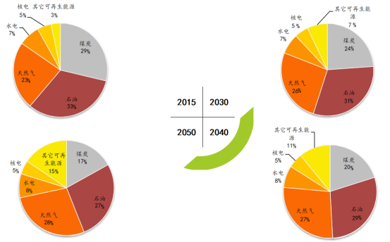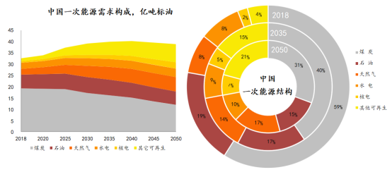 報(bào)告分析出:2035和2050年,我國(guó)非化石能源占比分別升至28%和37.8%,煤炭占一次能源需求的比重分別降至40.5%和30.7%。油氣占比在2035年后基本保持在31.5%左右;2035年,石油和天然氣占比分別為17.4%和14.2%;2050年,石油和天然氣占比分別15.2%和16.5%。