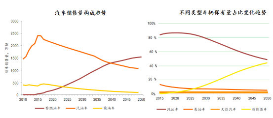 報(bào)告內(nèi)容顯示:我國(guó)新能源汽車保有量占比將穩(wěn)步提升,預(yù)計(jì)2035和2050年分別達(dá)到21.5%和44.2%。中國(guó)乘用車消費(fèi)增速進(jìn)入換檔期,同時(shí)考慮節(jié)油技術(shù)進(jìn)步,汽油需求增速將逐步回落,預(yù)計(jì)在2025年前達(dá)峰;之后隨著燃油效率提升、替代能源快速發(fā)展將穩(wěn)步回落。