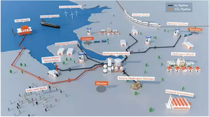 Hydeploy項(xiàng)目示意圖:黑色管線為氫氣運(yùn)輸管道,中間交匯處為制氫廠,橙色管線用于制氫過(guò)程中的二氧化碳捕捉