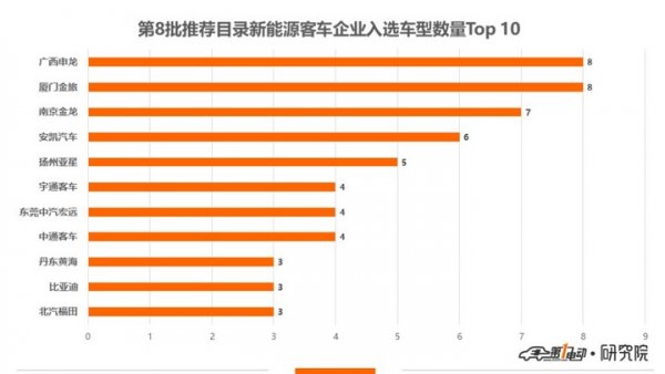 總體來看,Top10企業(yè)入選車型數(shù)量達(dá)3款或以上,其余23家客車生產(chǎn)企業(yè)入選車型為2款或1款。