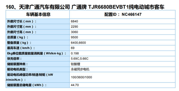 本批次入選的3款快充類純電動(dòng)客車均為廣通牌客車,分別來自成都廣通(型號(hào)為CAT6123CRBEVT純電動(dòng)城市客車)、天津廣通(型號(hào)為TJR6680BEVBT1純電動(dòng)城市客車)和蘭州廣通(型號(hào)為L(zhǎng)ZG6105BEVBT1純電動(dòng)城市客車)。