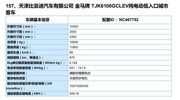 本批入選的82款非快充類純電動(dòng)客車車型來看,均可以達(dá)到這一標(biāo)準(zhǔn)。其中天津比亞迪一款型號(hào)為TJK6100GCLEV金馬牌純電動(dòng)低入口城市客車等速法續(xù)航里程最高,達(dá)670公里。