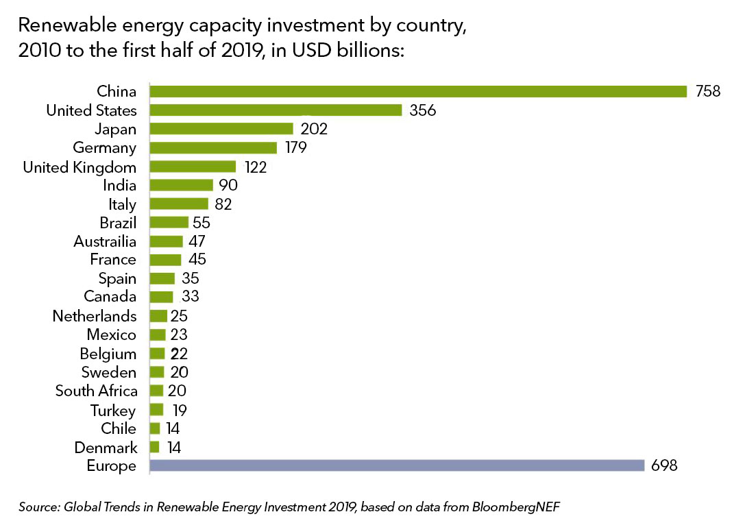 就國家和地區(qū)而言,中國仍然處于領(lǐng)先地位。中國在過去十年中一直是可再生能源產(chǎn)能的最大投資者,2010年至2019年上半年已承諾投入7580億美元,美國位居第二,3560億美元,日本第三,達(dá)到2020億美元。
