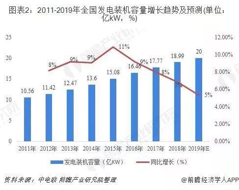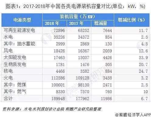 根據(jù)水電水利規(guī)劃設(shè)計總院發(fā)布的數(shù)據(jù):截止2018年年底,中國各類電源裝機容量189948萬kW,相比2017年增加11986萬kW,增長6.7%。中國主要可再生能源發(fā)電裝機容量72896kW,占全部電力裝機容量的38.4%。根據(jù)中電聯(lián)預(yù)測,截至2019年底,全國發(fā)電裝機容量20億千瓦左右,同比增長6%。