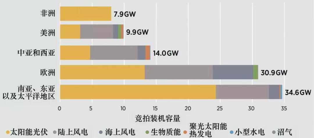南亞、東亞和太平洋地區的國家在運用可再生能源競拍機制方面,同樣經驗千差萬別,既有新進入者,也不乏經驗豐富者。為了推動經濟增長,很多剛剛采用該工具的南亞和東亞國家,都在積極利用豐富的太陽能資源和在成本上具有競爭力的光伏技術。馬來西亞、菲律賓、泰國和越南就是最好的例子。基于減輕支持太陽能光伏產業發展所面臨的財政壓力,日本也已經運用競拍機制。與此同時,兩大地區可再生能源大國中國和印度每年至少舉行10輪可再生能源競拍。從技術層面來看,這些地區的競拍主要針對太陽能光伏,其次是陸上風電。目前,海上風電的競拍規模同樣開始迅速擴大。