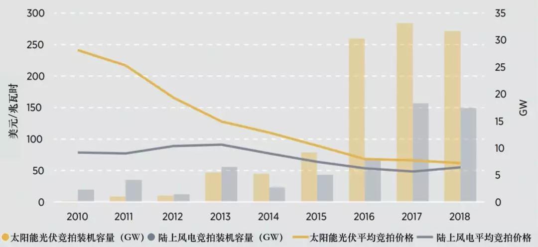 2010-2018年全球太陽能光伏與陸上風電的競拍裝機容量和平均競拍價格