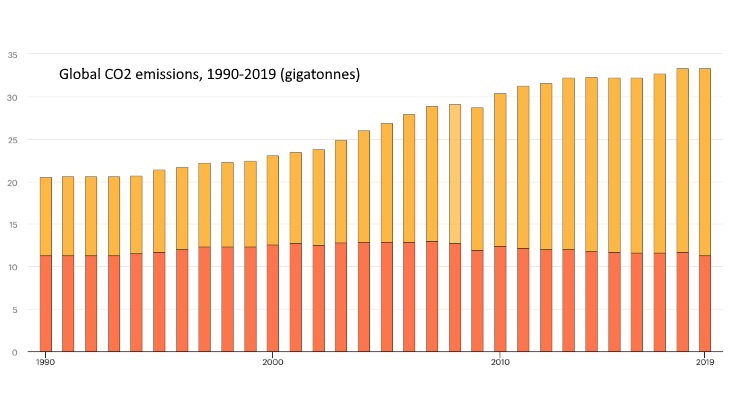 根據(jù)國際能源署(IEA)發(fā)布的數(shù)據(jù),2019年與能源相關(guān)的全球二氧化碳排放量停止增長。經(jīng)過兩年的增長,即使世界經(jīng)濟增長了2.9%,2019年全球排放量仍保持在330億噸。