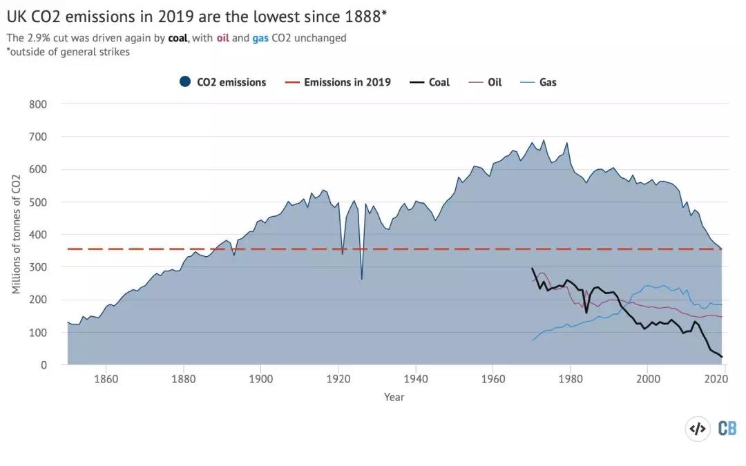 據英國CarbobBrief匯總的數據,英國2019年的二氧化碳排放量約為3.54億噸,比上一年下降2.9%。這是英國的碳排放連續第七年下降,比1990年的水平低41%,意味著英國2019年的碳排放量降至1888年的水平。