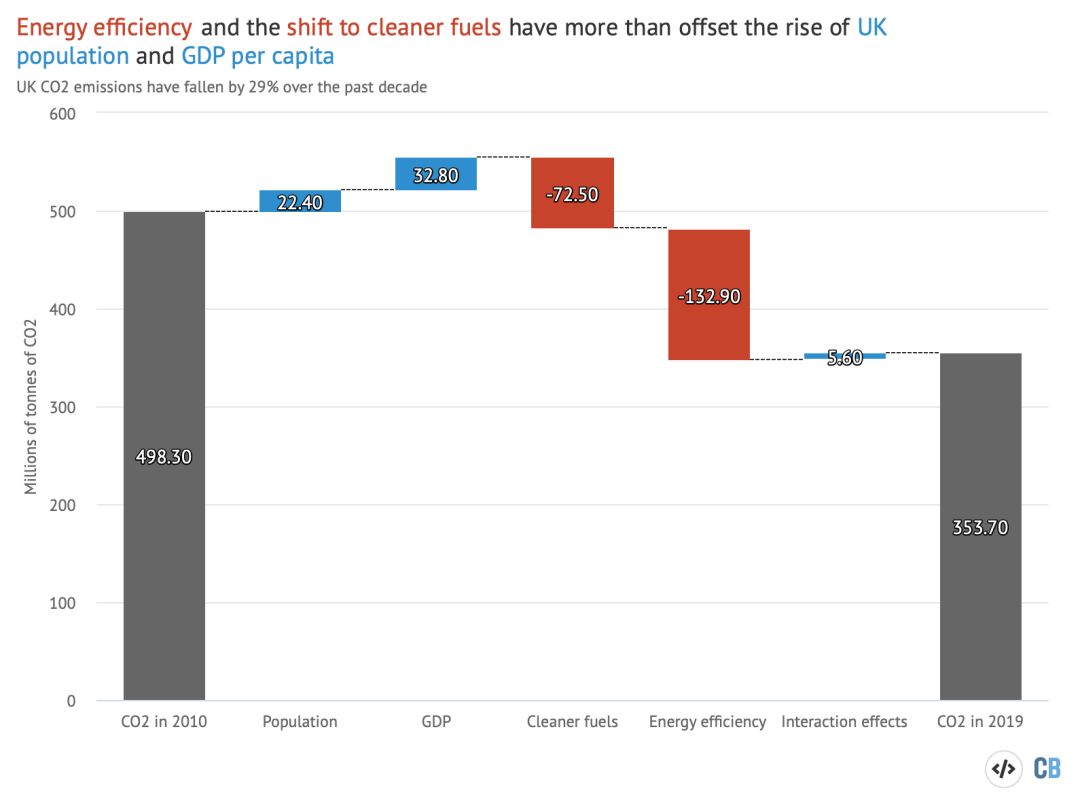 英國二氧化碳排放的下降主要靠能效的提高和低碳能源替代。與2010年(碳排放4.98億噸)相比,因為人口增加導致碳排放增加2240萬噸、經濟增長導致碳排放3280萬噸,而低碳能源替代導致碳排放下降7250億噸,而能效的提高導致碳排放下降高達1.33億噸。