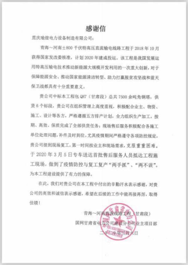 據悉,重慶順泰鐵塔制造有限公司瑜煌廠區近期收到國網甘肅省電力建設分公司業主項目部的感謝信,對重慶順泰按期、高效、保質完成青?!幽?plusmn;800千伏特高壓直流輸電線路工程(甘肅段)供貨任務,并在新冠肺炎疫情期間落實疫情防控與復工復產“兩手抓”、“兩不誤”,第一時間按照業主和現場需求,克服重重困難,派專車將首批售后服務人員送往施工現場,為該工程建設提供有力保障表示感謝。
