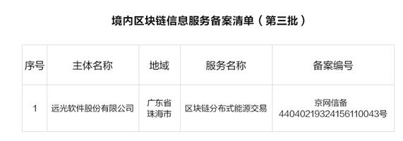 近日,國家互聯網信息辦公室(以下簡稱:國家網信辦)正式公布第三批境內區塊鏈信息服務備案編號,遠光軟件股份有限公司(SZ:002063)區塊鏈分布式能源交易位列其中,備案號粵網信備 44040219324156110043號 。截止目前,遠光軟件共有4個產品獲得了國家網信辦的備案號。