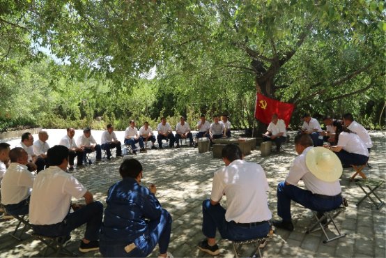 活動中,一行人先后來到陜甘邊區軍委、蘇維埃政府舊址,參觀舊址窯洞陳列,來到革命先輩們工作、生活的場景中進行體驗、感受。黨員同志們或駐足發問或相互討論,氣氛相當熱烈。在蘇維埃政府舊址院內,全體黨員面對黨旗,重溫入黨誓詞。在體驗式教育參觀結束后,與會黨員圍坐在蘇維埃政府舊址院內的大樹下,黨員方勇同志向大家分享了爺爺方世祿老紅軍的南梁故事,劉汀同志講述革命先驅劉志丹的英勇故事,激發了大家對那段崢嶸歲月里革命者的無限崇敬。接著,黨員楊虎誠誦讀了《習近平七年知青歲月》部分章節,積極分子董旭軍誦讀了《鄧穎超自述》部分章節。最后,大家合唱起改編自華池民歌《推炒面》的《軍民大生產》,唱起了讓無數人淚目的《我和我的祖國》,在嘹亮的歌聲中此次活動圓滿結束。