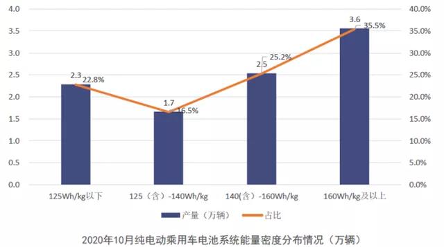 2020年10月,我國純電動乘用車系統能量密度在125Wh/kg以下和160Wh/kg以上車型產量分別為2.3萬輛和3.6萬輛,占比分別為22.8%和35.5%,125Wh/kg(含)-140Wh/kg以下車型產量占比達16.5%,較9月份上升7.9個百分點。