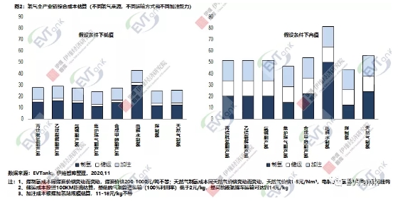 對于國內氫氣全產業鏈綜合成本,伊維智庫發布的《中國氫能行業發展白皮書(2020年)》顯示,在最理想的情況下,氫氣的“制取+儲運+加注”的全產業鏈成本可以做到25元/kg,但是EVTank也指出,該理想條件對于煤炭和天然氣的價格,對于氫氣儲運的方式和利用率,加氫站的投資建設規模等均提出了經濟學上的合理假設。對于不同制氫方式來看,EVTank發布的白皮書認為雖然電解水制氫被認為是最具發展前景的制氫方式,但是電解水制氫目前是成本最高的氫氣制取方式,電解水制氫的成本與電費的價格高度正相關也極為敏感。因此,要合理的降低電解水制氫的成本,需要從電解槽設備成本、能耗和大規模可再生能源發電等方面努力。