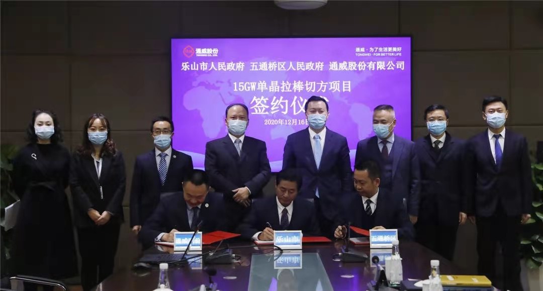12月16日,通威股份15GW單晶拉棒切方項目簽約儀式在成都通威國際中心成功舉行。通威股份與樂山市人民政府、五通橋區人民政府正式簽訂《通威股份15GW單晶拉棒切方項目》協議。樂山市委副書記、市長張彤,十一屆全國政協常委、全國人大代表、通威集團董事局劉漢元主席,樂山市副市長廖克全,五通橋區委副書記、區長李良,永祥股份副總經理袁中華,永祥硅材料副總經理張軍等領導出席簽約儀式。