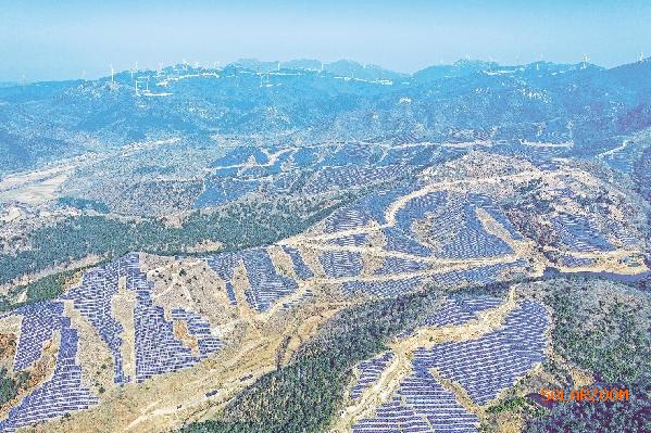 發電站背后十幾個山頭的向陽坡上,分散著占地700多畝的太陽能光伏發電場,在陽光下熠熠生輝。光伏板每塊約0.75平方米,總計有160萬塊,總裝機容量50兆瓦。在光照條件好的情況下,光伏板每天可發電近20萬千瓦時。
