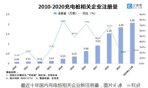 從相關數據上可以明顯看出,最近幾年來,國內與充電樁相關的企業注冊量一直呈現快速增長的態勢,2016年相關企業注冊量只有0.64萬家,2018年的新注冊量突破萬家,達到1.54萬家,2019年注冊量為1.86萬家。到了2020年,僅是前十一個月,國內充電樁相關的企業就新注冊了2.08萬家。