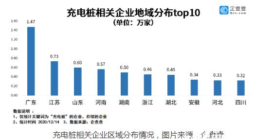 從分布地區看,廣東可謂是國內充電樁相關企業的大省,截至目前,廣東省共有1.47萬家相關企業。排名第二的是江蘇省,不過與廣東省相比,江蘇省的充電樁相關企業數量要少一半,有0.73萬家。此外,山東、河南、湖南也都是充電樁相關企業的聚集地,區域內的相關企業都超過了5000千家。