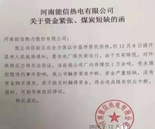 該函件寫道,其目前正在全力保證許昌市居民供熱,但當前廠內(nèi)存煤僅1萬余噸。由于受永煤違約事件影響,該公司融資渠道中斷,資金嚴重短缺,沒有資金購買煤炭,若不能及時融得資金,將會造成煤炭供應(yīng)中斷,進而導致機組停運。