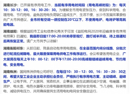 據(jù)長沙市發(fā)改委官網(wǎng)消息,湖南省發(fā)改委要求,12月8日起,全省啟動限電措施。要求全市7000余家大工業(yè)和一般工商業(yè)企業(yè)需錯峰生產(chǎn)、避峰讓電,限制高能耗、高排放等等工業(yè)用電。