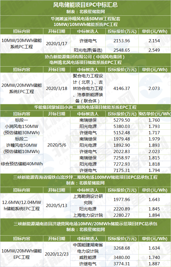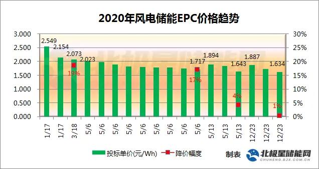 據北極星儲能網統計,2020年截至目前共有五個風電儲能項目公示中標價格,風電儲能中標單價從1月份的最高2.549元/Wh、降至了目前最低1.634元/Wh,一年內降幅達35.9%。