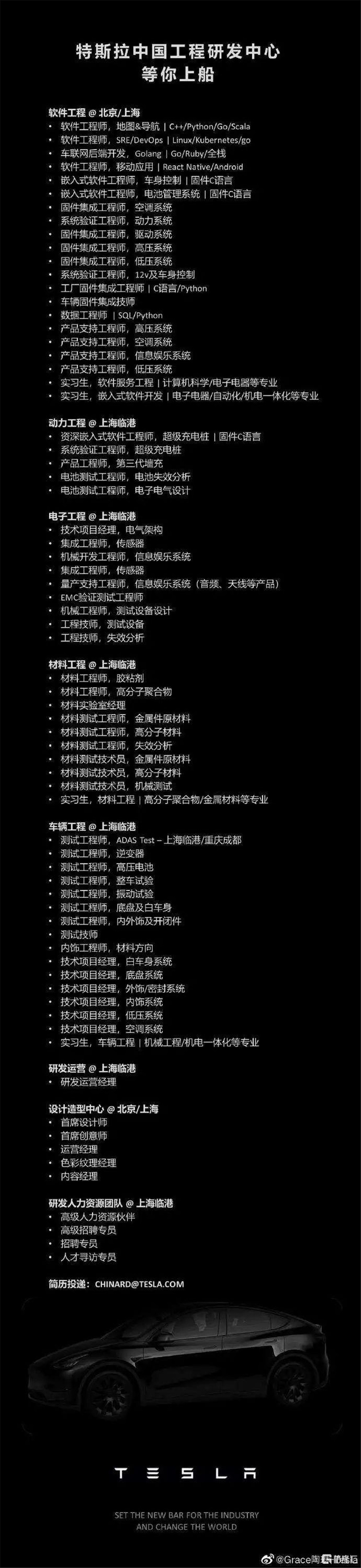 幾乎同一時間,1月11日早間,特斯拉對外事務(wù)副總裁陶琳發(fā)布了一條招聘微博,招聘軟件工程、動力工程、電子工程、材料工程以及車輛工程等多個工作崗位,工作地點(diǎn)主要在上海臨港。其中還包括設(shè)計造型中心崗,工作地點(diǎn)位于北京或上海,主要崗位包括首席設(shè)計師、首席創(chuàng)意師、色彩紋理經(jīng)理、內(nèi)容經(jīng)理以及運(yùn)營經(jīng)理等崗位。