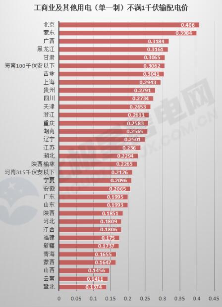 工商業(yè)及其他用電(單一制)1千伏輸配電價從高到低看,排在前五位的省份分別是:北京、蒙東、廣西、黑龍江、甘肅,北京最高為0.406元/千瓦時。排在后五位的分別是冀北、云南、山西、蒙西、青海,其中冀北最低為0.1374元/千瓦時。總體來看,全國工商業(yè)及其他用電(單一制)1千伏輸配電價平均水平為0.2393元/千瓦時,15個地區(qū)高于此水平(河北分為冀北和河北南部電網),18個地區(qū)低于此水平。如下所示: