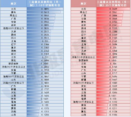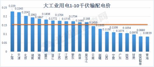 大工業(yè)用電1-10千伏輸配電價最高的為上海0.229元/千瓦時,最低的為青海0.0859元/千瓦時,平均水平為0.1546元/千瓦時。