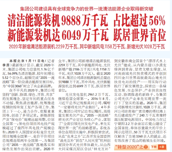 最新統計顯示,截至2020年末,集團公司電力總裝機1.76億千瓦,56.09%為清潔能源,較年初增長5.52個百分點,超額完成“2035一流戰略”第一階段清潔能源發展目標,為“中國3060”樹立了央企新品牌。