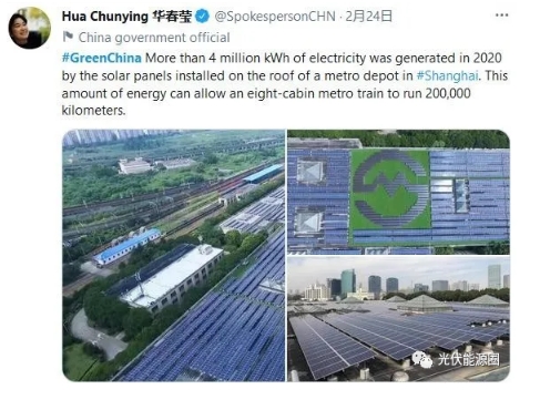 華春瑩在推特上說:“2020年,安裝在一座上海地鐵車站屋頂?shù)奶柲茈姵匕瀹a(chǎn)生了超過400萬千瓦時的電力,這些能量可以讓一輛8節(jié)編組的地鐵列車運行20萬公里。”