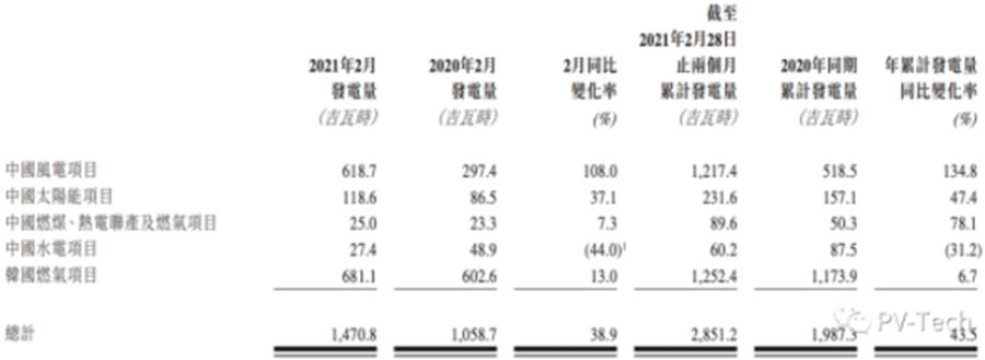 截至2021年2月28日止兩個月,集團累計完成發(fā)電量2851.2吉瓦時,比2020年同期增加43.5%。其中,中國風電項目增加134.8%,中國太陽能項目增加47.4%,中國燃煤、熱電聯(lián)產(chǎn)及燃氣項目增加78.1%,中國水電項目減少31.2%及韓國燃氣項目增加6.7%。