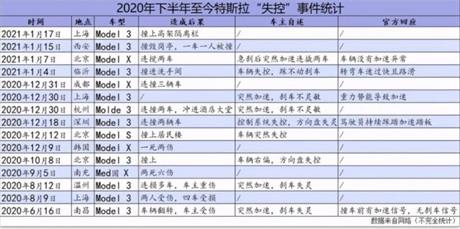 統計自2020年6月以來和特斯拉“行駛中突然加速”相關的事件和事故,僅公開報道的就已達數十條。
