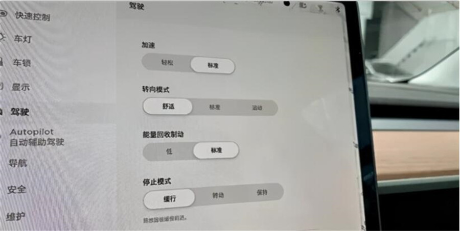 圖注:“單踏板功能”在特斯拉的系統中,其實并不是一個“功能”,而是一組選擇。當“動能回收”設置為標準,“停止模式”設置為保持,就是常說的單踏板模式了