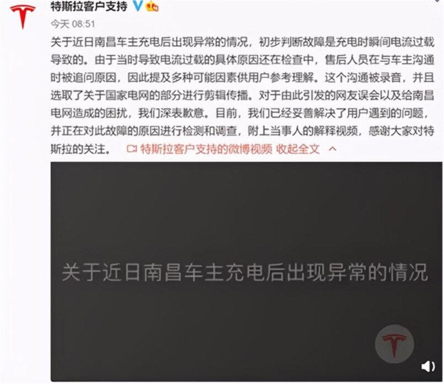 而說出“國家電網電流太大”這句話的特斯拉售后,也專門錄制說明視頻,公開承認責任在己。