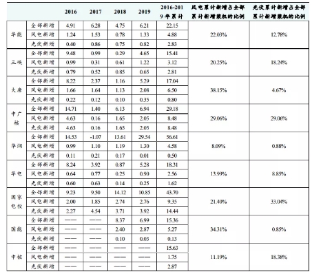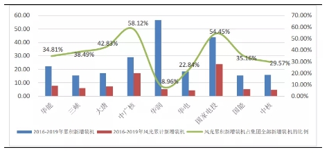 九大電力央企集團2016-2019風(fēng)電和光伏新增裝機情況(GW,%)