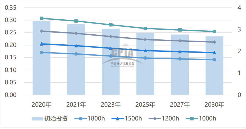 根據(jù)中國(guó)光伏協(xié)會(huì)(CPIA)發(fā)布的《中國(guó)光伏產(chǎn)業(yè)發(fā)展線路圖(2020版)》,2020年,全投資模型下的地面光伏電站在1800h、1500h、1200h、1000h的LCOE(平準(zhǔn)發(fā)電成本)分別為0.2、0.24、0.29、0.35元/kWh(分布式光伏電站為0.17、0.2、0.26、0.31元/kWh)。2021年后在大部分地區(qū)實(shí)現(xiàn)與煤電基準(zhǔn)同價(jià)。