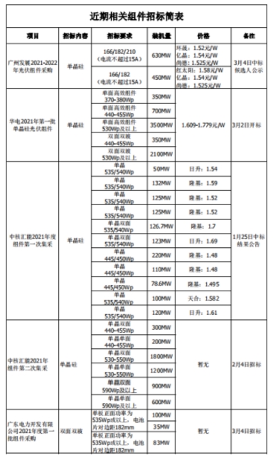 由上述表格中系列招標會發現,時間相對最早的中核一次集采價格相較最低,在11個標段中,最低價格1.48元/W;廣州發展1.08GW中標價格有所提升,最低價格為1.52元/W,照比中核一次集采單瓦提升0.04元;3月2日開標的華電一次集采價格則全面上調,最低價格為1.609元/W,最高價格則達到1.779元/W,直逼1.80元/W。