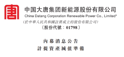 日前,大唐集團旗下上市公司大唐新能源發布了《內幕消息公告-計提資產減值準備》。