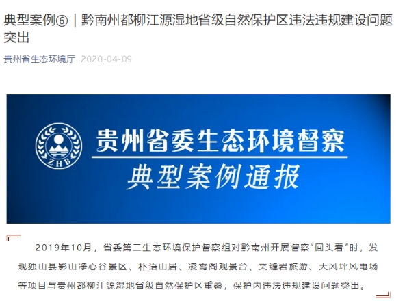 據貴州省生態環境廳2020年4月9日通報的《典型案例⑥|黔南州都柳江源濕地省級自然保護區違法違規建設問題突出》推文顯示,2019年10月,省委第二生態環境保護督察組對黔南州開展督察“回頭看”時,發現大風坪風電場等項目與貴州都柳江源濕地省級自然保護區重疊,保護內違法違規建設問題突出。