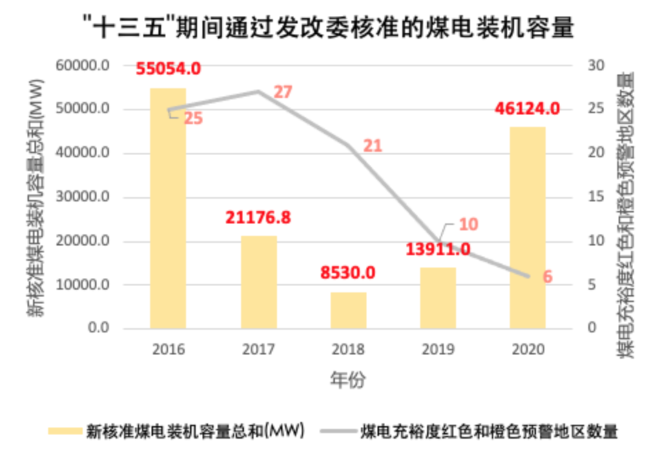 2016年至2020年通過發改委核準的煤電裝機總量變化趨勢以及國家能源局在2016年至2020年每年發布的煤電裝機充裕度預警為紅色和橙色的地區數量變化。制圖:綠色和平
