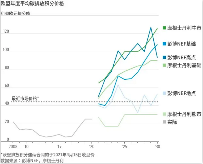 歐盟的可交易碳排放積分是今年表現最好的大宗商品之一,到目前為止價格累計上漲超36%,在46歐元左右。大摩分析師甚至看漲碳價在2030年漲破120歐元。