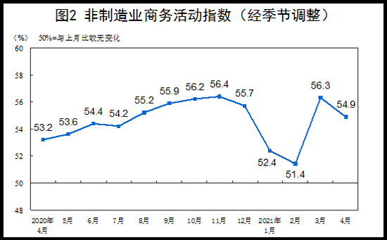 4月份,非制造業(yè)商務(wù)活動(dòng)指數(shù)為54.9%,較上月回落1.4個(gè)百分點(diǎn),非制造業(yè)擴(kuò)張步伐有所放緩。