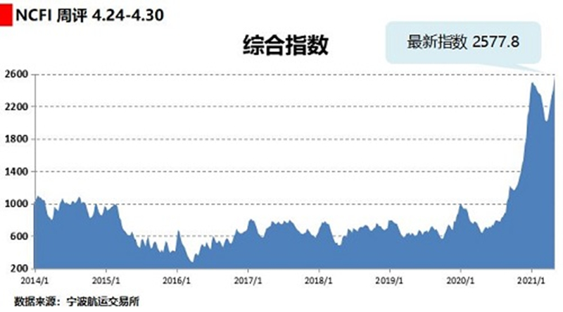 寧波航運交易所發布的海上絲綢之路指數之寧波出口集裝箱運價指數(NCFI)顯示:4月24日至30日,該指數報收于2577.8點,較上周上漲7.0%,綜合指數突破年前高位(2021年1月8日報收于2498.5點),刷新歷史新高。
